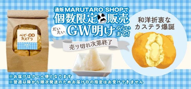 通販MARUTARO SHOPにベビーまるカステラの新フレーバーが個数限定で登場です♪試作を重ねて出来上がったのは、ふんわりやさしい「みるく味」!ほんのりおしょうゆの香りがするカステラの中にみるく味の餡を入れた和洋折衷のお味ですYO!☆濃厚だけどあっさりな甘さでやめられない!止まらない!個数限定で売り切れ次第終了となりますので、この機会にぜひご賞味くださいね。